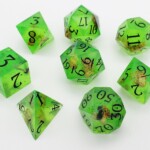 There are all sorts of inclusions ranging from glitter to mica powder (for more opaque/shimmery colors) to food dye (transparent color), to alcohol ink (swirls of color–still working on that) to even bark, top ramen, dried flowers, to M&Ms etc. With the right prep, almost anything (that is small enough) can be made into a dice. It might ruin the weighting of your dice (i.e. gun shells or gears), but it can look awesome anyway.