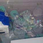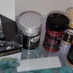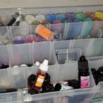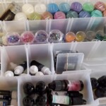 In our organizer, mica powder is at the back, and it’s a very fine powder that gives a shimmery, transparent or opaque color, depending on how much you use while mixing. A little goes a long way. Then there’s the glitter, of which we have very fine and chunky. The food dye are the little bottles, and a type of alcohol ink labeled very inconveniently by food rather than color are in the front. Further down, there’s a diamond glitter I got, hoping it’d be a bit more holographic, some crumpled up mylar, and some actual holographic nail glitter. As of writing this post, I haven’t tried the latter, but plan to shortly.