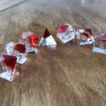 Once your molds are full, you need to let them sit and cure, likely for 24 hours, depending on the type of resin (with Art ‘N Glow it’s 24 hours–I don’t know anything about UV resin at this point). DO NOT TAKE YOUR DICE OUT TOO SOON – THEY WON’T BE DONE YET. Thinking of curing like baking, without the heat. If you take it out too soon, you’ll get a mess.